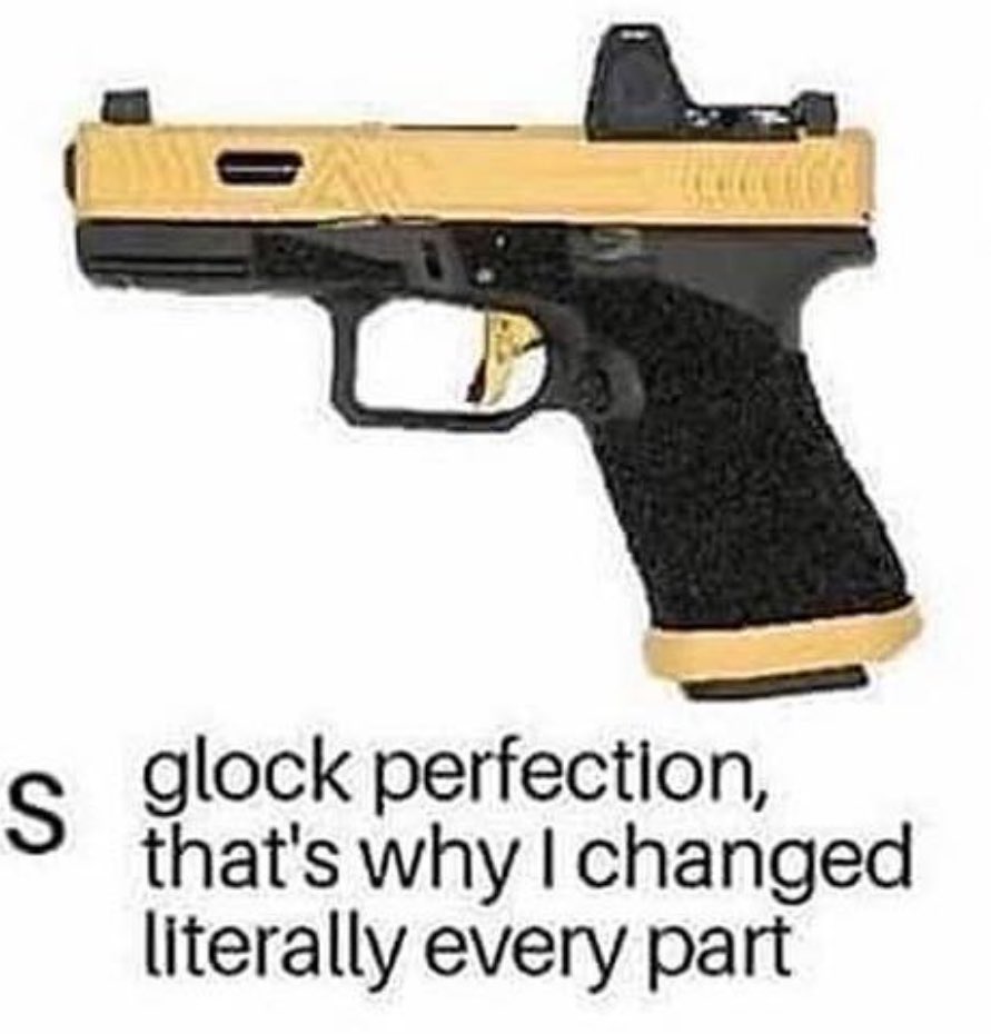 MikedaddyH said: View attachment 30614 At least I can laugh at myself Click to expand... Never owned a Glock in my life. Just like building a simple handgun that I can count on going bang repeatedly at my trigger fingers command.