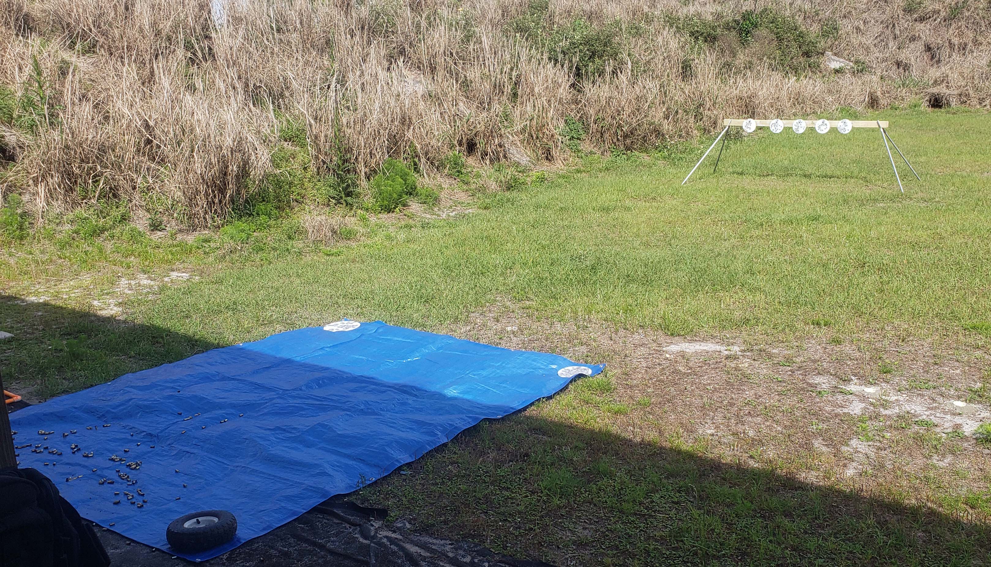 Eight of the usual sixteen+ of us showed, and Scott had a couple stages in mind. First was a "plate rack" with timer used. The tarp is to help round up cases as the club president had a complaint about that.