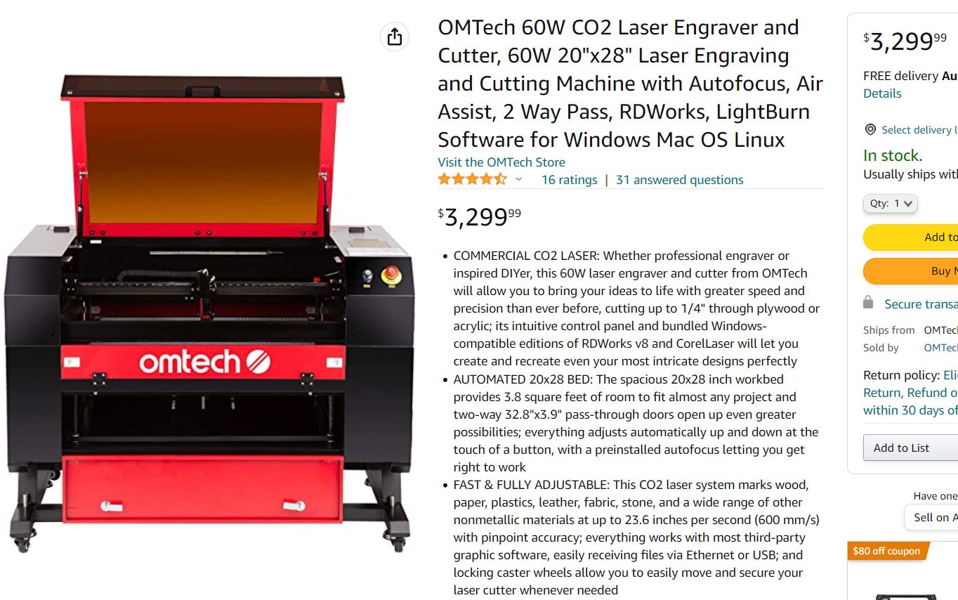 About lasers: I had a 60W CO2 OMTech (Orion) big boy laser engraver for a short while similar to the one in the pic. I went and looked at as a lark because the seller didn't want a lot of money for it because it wasn't turning on so maybe I could fix it if the price was right. Plus it was about 10min away. Took some info off it and did a little research and was considering an offer when the seller got back to me and told me to "just come get it out of here!"![]()