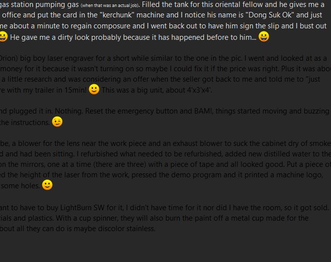 Serial number engraving. Full power, slow speed, not deep enough to be able to feel the marks, though. Still fun.
