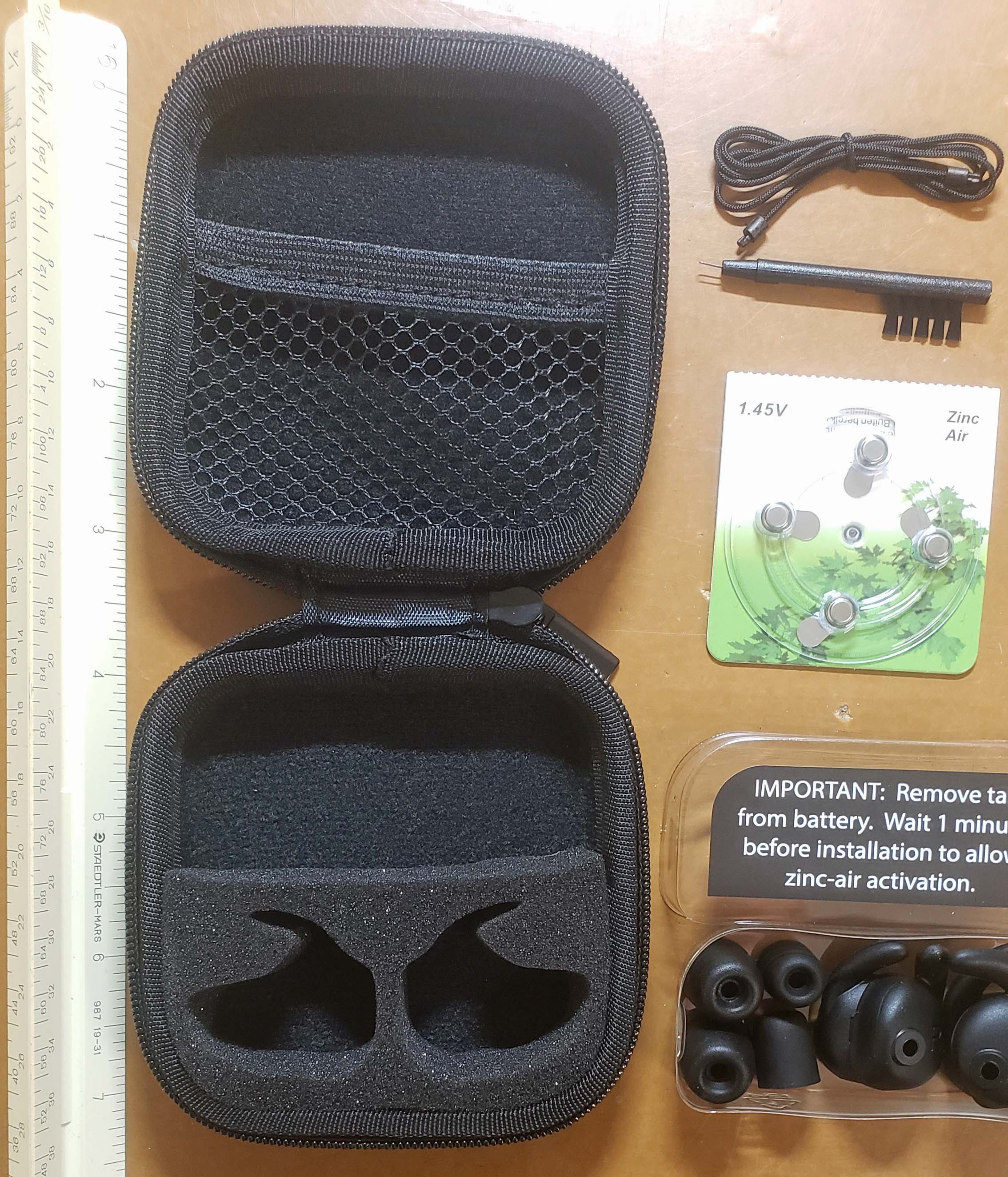 They come with the items shown, a swell carrying case, 6 sizing "fins", 6 foam tips, lanyard, little brush/magnet tool, #10 hearing aid batteries (4) and literature. The fins/tips are S, M, L with M installed.