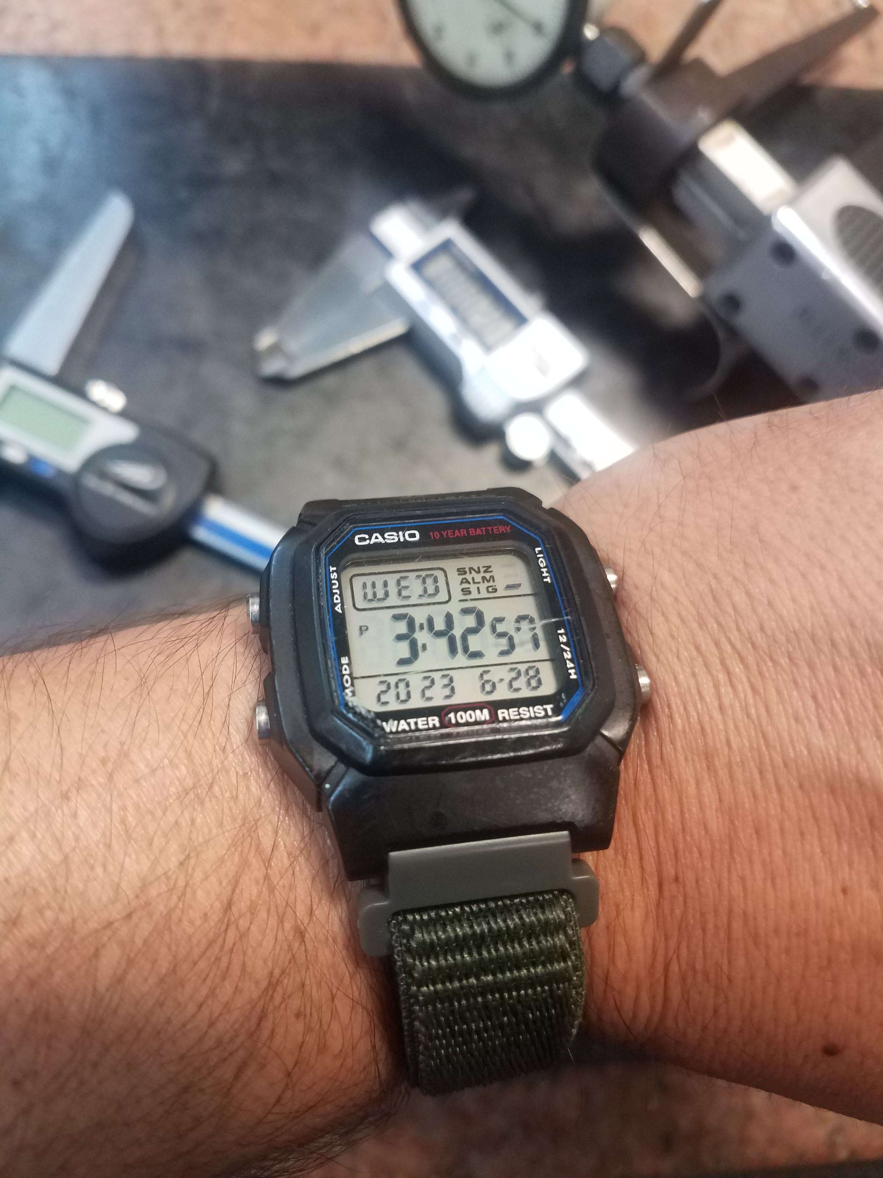 Another Casio man!Casio W800H. I have an ugly china velcro band but it's fits a little better than the stock band since I'm between hole sizes